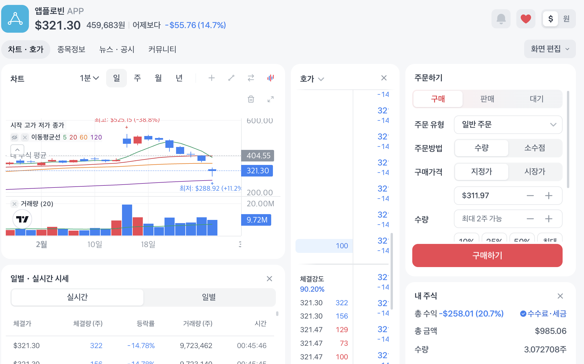 ์ค๋ AppLovin(์ฑํ๋ก๋น, NASDAQ: APP)์ด ๊ณต๋งค๋ ๋ฆฌํฌํธ์ ์ํด ์ฃผ๊ฐ๊ฐ ๊ธ๋ฝํ์ต๋๋ค. (์๋ S&P 500 ์ง์ ์ฌ๋ถ๊ฐ ์์๋๋ฐ... ํ๋ค๊ฒ ๋์์์ง๋..)
