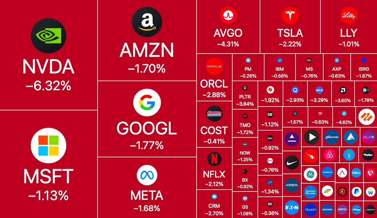 ๐ ๋ธ๋ก๋์ปด(-7.11%), AMD(-4.99%) ๋ฑ ๋ฐ๋์ฒด์ฃผ ์ ๋ฐ์ ํ๋ฝ